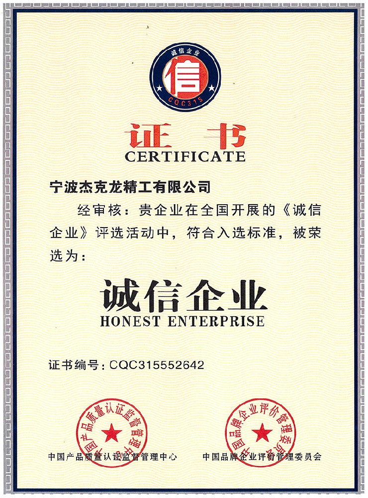 杰克龍精工先后通過了ISO9001、ISO14001和ISO45001三大管理體系認證,杰克龍精工被認定為“高新技術企業”。